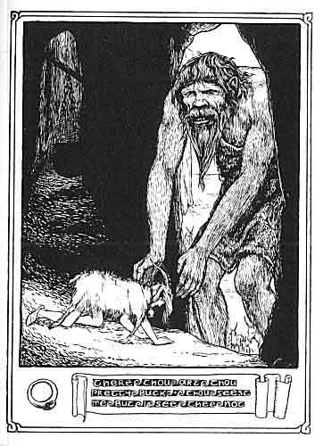 "I was then," said Conall, " quite a young lad, and I went out hunting, and my father's land was beside the sea, and it was rough with rocks, caves, and rifts. When I was going on the top of the shore, I saw as if there were a smoke coming up between two rocks, and I began to look what might be the meaning of the smoke coming up there. When I was looking, what should I do but fall; and the place was so full of heather, that neither bone nor skin was broken. I knew not how I should get out of this. I was not looking before me, but I kept looking overhead the way I came--and thinking that the day would never come that I could get up there. It was terrible for me to be there till I should die. I heard a great clattering coming, and what was there but a great giant and two dozen of goats with him, and a buck at their head. And when the giant had tied the goats, he came up and he said to me, 'Hao O! Conall, it's long since my knife has been rusting in my pouch waiting for thy tender flesh.' 'Och!' said I, 'it's not much you will be bettered by me, though you should tear me asunder; I will make but one meal for you. But I see that you are one-eyed. I am a good leech, and I will give you the sight of the other eye.' The giant went and he drew the great caldron on the site of the fire. I myself was telling him how