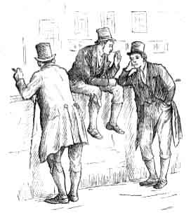 Along the quays up to Saint Patrick's Bridge there is a certain bustle. Some forty ships may be lying at anchor along the walls of the quay, and its pavements are covered with goods of various merchandise: here a cargo of hides; yonder a company of soldiers, their kits and their Dollies who are taking leave of the redcoats at the steamer's side. Then you shall see a fine, squeaking, shrieking drove of pigs embarking by the same conveyance, and insinuated into the steamer by all sorts of coaxing, threatening, and wheedling. Seamen are singing and yeehoing on board, grimy colliers smoking at the liquor shops along the quay, and as for the bridge--there is a crowd of idlers on that, you may be sure sprawling over the balustrade for ever and ever, with long ragged coats, steeple-hats, and stumpy doodeens [A clay pipe. KF.].