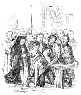 I went into it, not without awe (for, as I confessed before, I always feel a sort of tremor on going into a Catholic place of worship: the candles, and altars, and mysteries, the priest and his robes, and nasal chanting, and wonderful genuflexions, will frighten me as long as I live). The chapel-yard was filled with men and women; a couple of shabby old beadles were at the gate, with copper shovels to collect money, and inside the chapel four or five hundred people were on their knees, and scores more of the blue-mantles came in, dropping their curtsies as they entered, and then taking their places on the flags.