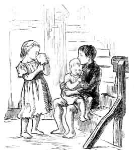 In the cottages, the inhabitants looked healthy and rosy in their rags, and the cots themselves in the sunshine almost comfortable. After a couple of months in the country, the stranger's eye grows somewhat accustomed to the rags: they do not frighten him as at first; the people who wear them look for the most part healthy enough: especially the small children--those who can scarcely totter, and are sitting shading their eyes at the door, and leaving the unfinished dirt-pie to shout as the coach passes by--are as healthy a looking race as one will often see. Nor can any one pass through the land without being touched by the extreme love of children among the people: they swarm everywhere, and the whole country rings with cries of affection towards the children, with the songs of young ragged nurses dandling babies on their knees, and warnings of mothers to Patsey to come out of the mud, or Norey to get off the pig's back.