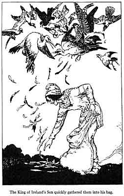 He sat down and ate and drank and he felt hopeful seeing Fedelma beside him. When he had eaten Fedelma said, "My blue falcon will gather the birds and pull the feathers off for you. Still, unless you gather them quickly there is danger, for the roof must be thatched with feathers at the set of sun." She whistled and her blue falcon came. He followed it across the moor. The blue falcon flew up in the air and gave a bird-call. Birds gathered and she swooped amongst them pulling feathers off their backs and out of their wings. Soon there was a heap of feathers on the ground--pigeons' feathers and pie's feathers, crane's and crow's, blackbird's and starling's. The King of Ireland's Son quickly gathered them into his bag. The falcon flew to another place and gave her bird-call again. The birds gathered, and she went amongst them, plucking their feathers. The King's Son gathered them and the blue falcon flew to another place. Over and over again the blue falcon called to the birds and plucked out their feathers, and over and over again the King's Son gathered them into his bag. When he thought he had feathers enough to thatch the roof he ran back to the shelter. He began the thatching, binding the feathers down with little willow rods. He had just finished when the sun went down. The old Enchanter came up and when he saw what the King's Son had done he was greatly surprised. "You surely learned from the wizard you were apprenticed to," said he.. "But to-morrow I will try you with another task. Go now and sleep in the place where you were last night." The King's Son, glad that the head was still on his shoulders, went and lay down in the water-tank.