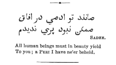 [e] translated by Mr. Duncan Forbes. It is to be regretted that he has employed the terms Fairies and Demons instead of Peries and Deevs.