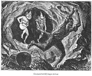 There is, chiefly in Southern Germany, a species of beings that greatly resemble the Dwarfs. They are called Wichtlein (Little Wights), and are about three quarters of an ell high. Their appearance is that of old men with long beards. They haunt the mines, and are dressed like miners, with a white hood to their shirts and leather aprons, and are provided with lanterns, mallets, and hammers. They amuse themselves with pelting the workmen with small stones, but do them no injury, except when they are abused and cursed by them.