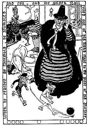 Now one day when Elidyr was with his mother, he told her of the heavy yellow balls which the King's son. and he used in their play. His mother knew that they must be made of gold, and she said to him, "Bring one of them with you next time you come." "It would not be right to do that," said the boy. "What is the harm?" asked his mother. "I have been told never to bring anything with me to earth," replied Elidyr, "Surely, out of the hundreds of balls which the King's son has, he would not miss just one," pleaded the mother, and the boy reluctantly consented. Some days after, when he thought no one was looking, he took up one of the golden balls, and started off to his mother's cottage, walking at first slowly, but increasing his pace as he drew nearer to the upper air. Just as he emerged out of the underground passage on to the earth, he thought he heard tiny footsteps pattering behind him, and he started to run. Turning his head round, he saw two little men running after him and looking very grim. He put his best foot forward and tore ahead; the little men raced after him, but Elidyr having the start reached the cottage first. When he reached the threshold, he stumbled and fell, and the golden ball rolled out of his hand right to the feet of his mother. At that moment the two little men jumped over him as he lay sprawling, seized the ball and rushed out of the house. As they passed Elidyr they spat at him and shouted, "Thief, traitor, false mortal," and other terms of reproach.