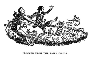 Two farm servants named Rhys and Llewellyn were one evening at twilight returning home from their work, when Rhys cried Out that he heard the fairy music. Llewellyn could hear nothing, but Rhys said it was a tune to which he had danced a hundred times, and would again, and at once. 'Go on,, says he, ' and I'll soon catch you up again.' Llewellyn objected, but Rhys stopped to hear no more; he bounded away and left Llewellyn to go home alone, which he did, believing Rhys had merely gone off on a spree, and would come home drunk before morning. But the morning came, and no Rhys. In vain search was made, still no Rhys. Time passed on; days grew into months; and at last suspicion fell on Llewellyn, that he had murdered RIys. He was put in prison. A farmer learned in fairy-lore, suspecting how it was, proposed that he and a company of neighbours should go with poor Llewellyn to the spot where lie had last seen Rhys. Agreed. Arrived at the spot, ' Hush,' cried Llewellyn, 'I hear music! I hear the sweet music of the harps! ' They all listened, but could hear nothing. ' Put your foot on mine, David,' says Llewellyn to one of the company; his own foot was on the outward edge of a fairy ring as lie spoke. David put his foot on Llewellyn's, and so did they all, one after another; and then they beard the sound of many harps, and saw within a circle about twenty feet across, great numbers of little people dancing round and round. And there was Rhys, dancing away like a madman! As he came whirling by, Llewellyn caught him by his smockfrock and pulled him out of the circle. 'Where are the horses? where are the horses?' cried Rhys in an excited manner. ' Horses, indeed!' sneered Llewellyn, in great disgust; 'wfft! go home. Horses! But Rhys was for dancing longer, declaring he had not been there five minutes. You've been there,' says Llewellyn, 'long enough to come near getting me hanged, anyhow.' They got him home finally, but he was never the same man again, and soon after he died.