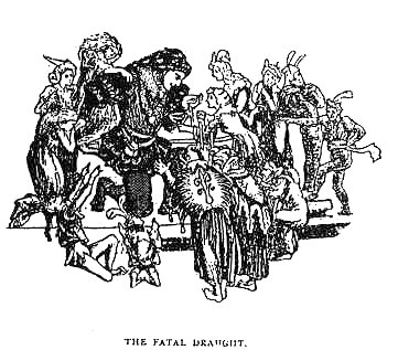 The scene of the tale is that Vale of Neath, already named as a famous centre of fairyland. Elidurus, when a youth of twelve years, 'in order to avoid the severity of his preceptor,' ran away from school, 'and concealed himself under the hollow bank of a river. After he had fasted in that situation for two days, 'two little men of pigmy stature appeared to him,' and said, 'If you will go with us, we will lead you into a country full of delights and sports.' Assenting, Elidurus rose up and 'followed his guides through a path at first subterraneous and dark, into a most beautiful country, but obscure and not illuminated with the full light of the sun.' All the days in that country 'were cloudy, and the nights extremely dark.' The boy was brought before the king of the strange little people, and introduced to him in the presence of his Court. Having examined Elidurus for a long time, the king delivered him to his son, that prince being then a boy. The men of this country, though of the smallest stature, were very well proportioned, fair-complexioned, and wore long hair. 'They had horses and greyhounds adapted to their size. They neither ate flesh nor fish, but lived on milk-diet, made up into messes with saffron. As often as they returned from our hemisphere, they reprobated our ambition, infidelities, and inconstancies; and though they had no form of public worship, were, it seems, strict lovers and reverers of truth. The boy frequently returned to our hemisphere, sometimes by the way he had gone, sometimes by others; at first in company, and afterwards alone; and made himself known only to his mother, to whom be described what he had seen. Being desired by her to bring her a present of gold, with which that country abounded, he stole, whilst at play with the king's son, a golden ball with which he used to divert himself, and brought it in haste to his mother, but not un-pursued; for, as he entered the house of his father, he stumbled at the threshold;' the ball fell, 'and two pigmies seizing it, departed, showing the boy every mark of contempt and derision. Notwithstanding every attempt for the space of a year, he never again could find the track to the subterraneous passage. He had made himself acquainted with the language of his late hosts, ' which was very conformable to the Greek idiom. When they asked for water, they said Udor udorum; when they want salt, they say Halgein udorum. [See Sir R. C. Hoare's Translation of Giraldus]
