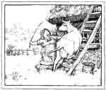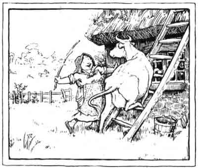Well, he set out, and he travelled a long way, and at last he came to a woman's cottage that had some grass growing on the roof. And the woman was trying to get her cow to go up a ladder to the grass, and the poor thing durst not go. So the gentleman asked the woman what she was doing. 'Why, lookye,' she said, 'look at all that beautiful grass. I'm going to get the cow on to the roof to eat it. She'll be quite safe, for I shall tie a string round her neck, and pass it down the chimney, and tie it to my wrist as I go about the house, so she can't fall off without my knowing it.' 'Oh, you poor silly!' said the gentleman, 'you should cut the grass and throw it down to the cow!' But the woman thought it was easier to get the cow up