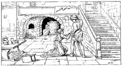 But Lady Mary was a brave one, she was, and she opened the door, and what do you think she saw? Why, bodies and skeletons of beautiful young ladies all stained with blood. So Lady Mary thought it was high time to get out of that horrid place, and she closed the door, went through the gallery, and was just going down the stairs, and out of the hall, when who should she see through the window but Mr Fox dragging a beautiful young lady along from the gateway to the door. Lady Mary rushed downstairs, and hid herself behind a cask, just in time, as Mr Fox came in with the poor young lady, who seemed to have fainted. Just as he got near Lady Mary, Mr Fox saw a diamond ring glittering on the finger of the young lady he was dragging, and he tried to pull it off. But it was tightly fixed,