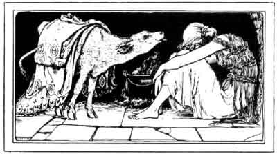 Now, after a while, the king married again an ill-natured wife with three ugly daughters of her own. And they hated the king's daughter because she was so bonny. So they took all her fine clothes away from her, and gave her only a coat made of rushes. So they called her Rushen Coatie, and made her sit in the kitchen nook, amid the ashes. And when dinner-time came, the nasty stepmother sent her out a thimbleful of broth, a grain of barley, a thread of meat, and a crumb of bread. But when she had eaten all this, she was just as hungry as before, so she said to herself: 'Oh! how I wish I had something to eat.' Just then, who should come in but a little red calf, and said to her: 'Put your finger into my left ear.' She did so, and found some nice bread. Then the calf told her to put her finger into its right ear, and she found there some cheese, and made a right good meal of the bread and cheese. And so it went on from day to day.