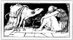 Now the king's wife thought Rushen Coatie would soon die from the scanty food she got, and she was surprised to see her as lively and healthy as ever. So she set one of her ugly daughters on the watch at meal-times to find out how Rushen Coatie got enough to live on. The daughter soon found out that the red calf gave food to Rushen Coatie, and told her mother. So her mother went to the king and told him she was longing to have a sweetbread from a red calf. Then the king sent for his butcher, and had the little calf killed. And when Rushen Coatie heard of it, she sate down and wept by its side, but the dead calf said: