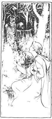 Many, many days after he had disappeared, Burd Janet was wandering in Carterhaugh Wood, though she had been warned not to go there. And as she wandered she plucked the flowers from the bushes. She came at last to a bush of broom and began plucking it. She had not taken more than three flowerets when by her side up started young Tamlane.