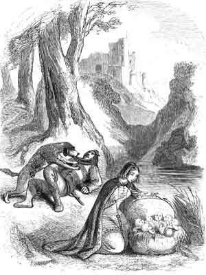The Countess soon perceived that the bright and jewelled lady, seated in the car, was no other than her old acquaintance, the Princess Pickett. She and all her train stopped at the very spot where, so many years before, the seven children had been found in the basket by the Countess of Devon, and saved by her, with the assistance of her bloodhound, from a watery grave; the noble animal, though grown very old, now again sprang to her side; for he never forsook his mistress.