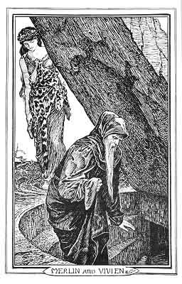 SIR TOR proved before long by his gallant deeds that he was worthy to sit in one of the two empty seats of the Round Table. Many of the other Knights went out also in search of adventures, and one of them, Sir Pellinore, brought a damsel of the lake to Arthur's Court, and when Merlin saw her he fell in love with her, so that he desired to be always in her company. The damsel laughed in secret at Merlin, but made use of him to tell her all she would know, and the wizard had no strength to say her nay, though he knew what would come of it. For he told King Arthur that before long he should be put into the earth alive, for all his cunning. He likewise told the King many things that should befall him, and warned him always to keep the scabbard as well as the sword Excalibur, and foretold that both sword and scabbard should be stolen from him by a woman whom he most trusted. 'You will miss my counsel sorely,' added Merlin, 'and would give all your lands to have me back again.' 'But since you know what will happen,' said the King, 'you may surely guard against it.' 'No,' answered Merlin, 'that will not be.' So he departed from the King, and the maiden followed him whom some call Nimue and others Vivien, and wherever she went Merlin went also.
