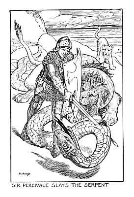 At that the fiend which had taken the shape of a horse shook off Sir Percivale and dashed into the water, crying and making great sorrow; and it seemed to him that the water burned. Then Sir Percivale knew that it was not a horse but a fiend, which would have brought him to perdition, and he gave thanks and prayed all that night long. As soon as it was day he looked about him, and saw he was in a wild mountain, girt round with the sea and filled with wild beasts. Then he rose and went into a valley, and there he saw a young serpent bring a young lion by the neck, and after that there passed a great lion, crying and roaring after the serpent, and a fierce battle began between them. Sir Percivale thought to help the lion, as he was the more