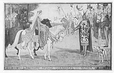 attended on Sir Lancelot. He and the Queen wore dresses of white and gold tissue, and their horses were clothed in housings of the same, set with precious stones and pearls; and no man had ever gazed on such a noble pair, as they rode from Joyous Gard to Carlisle. When they reached the castle, Sir Lancelot sprang from his horse and helped the Queen from hers, and led her to where King Arthur sat, with Sir Gawaine and many Lords around him. He kneeled down, and the Queen kneeled with him, and many Knights wept as though it had been their own kin. But Arthur sat still and said nothing. At that Sir Lancelot rose, and the Queen likewise, and, looking straight at the King, he spoke: