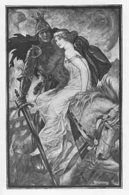 [paragraph continues] One evening she noted, far across the plain, towers and buildings shining in the sun, and an array of horsemen ride forth to meet her. One stopped before her dazzled eyes, and leaping from his horse bowed low. Arthur had come to welcome her, and do her honour, and to lead her home. But looking up at him, she thought him cold, and, timid and alone, her thoughts turned again to Lancelot. After that the days and years slipped by, and these two were ever nearest the King, and in every time of danger the King cried for Lancelot, and trusted his honour and the Queen's to him. Sir Lancelot spoke truly when he told Elaine that he had never worn the badge of lady or maiden, but for all that every one looked on Sir Lancelot as the Queen's Knight, who could do no worship to any other woman. The King likewise held Sir Lancelot bound to fight the Queen's battles,-and if he was absent on adventures of his own, messengers hastened to bring him back, as in the fight with Sir Mador. So things went on for many years, and the King never guessed that the Queen loved Lancelot best.