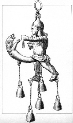 To this figure are suspended five little bells. We have said in out Introduction that these instruments were considered as talismans against evil. But here they can only serve as a symbol of the triumph which the gladiator is about to obtain. We know indeed that the ancients, and especially the Romans, compelled the conquered and the slaves who followed the car of the conqueror to carry little bells, which the Latins called tintinnabula.