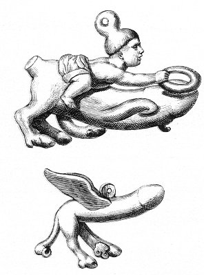A TWO-FOOTED phallus, having itself a second phallus and two wings, or fins, is represented by this lamp. A little child, wearing a kind of Phrygian cap, which served to suspend the lamp, is seated astride on this singular Priapus, and leans to place a crown upon its head. Some antiquaries have considered this crown to be intended as a sort of check which the young rider was desirous to put on his steed; but the opinion does not appear to us tenable. The ancients used bits for their horses which in no wise resembled the object we have here.