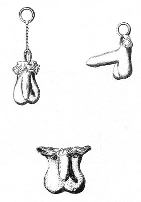THESE three phalluses in bronze are so many amulets which the ancients were accustomed to wear: the men in order to keep away sorceries, the women for the same object, and also in order that they might become fruitful when they wished. Some of these amulets were made of isinglass, others of bone, ivory, terra cotta, or other material.