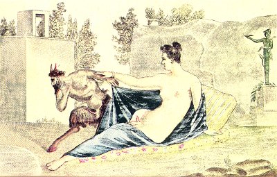 A SATYR has surprised a nymph asleep in a solitary place. He prepares to violate her, and already having lifted up the veil that envelops her, he casts a profane look on her most secret charms; but imagine his confusion on perceiving that he has accosted a hermaphrodite! Full of shame and vexation, he seeks to fly; but the hermaphrodite, whose sleep was doubtless only a feint, tries to hold him, and seems himself to promise him pleasures of which he had not dreamt.