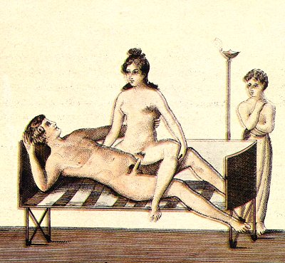 A YOUNG and beautiful married couple are amorously toying on a small bed. A lighted lamp shows that the scene takes place at night-time. As in the previous picture, the young man is carelessly stretched on his back, while his obliging companion, seated astraddle over him, is left to perform the principal part. In the background may be seen the cubicular slave, who is attentively watching the voluptuous pastime, and seems to be even looking on it with a lustful eye--