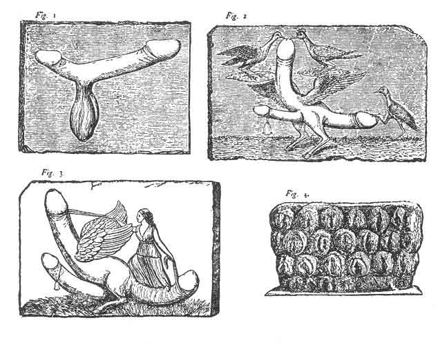 Several examples of these triple phalli occur in the Musée Secret of the antiquities of Herculaneum and Pompeii. In the examples figured in that work, the hind part of the main phallus assumes clearly