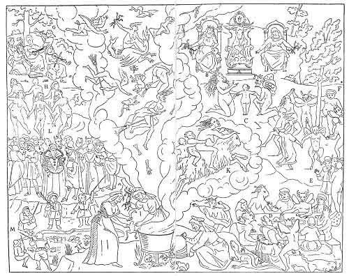 the witches, each with her demon, seated at table. E, a party of four witches and sorcerers, who are only admitted as spectators, and are not allowed to approach the great ceremonies. F, "according to the old proverb, Après la pance, vient la dance," the witches and their demons have risen from table, and are here engaged in one of the descriptions of dances mentioned above. G, the players on instruments, who furnish the music to which the witches dance. H, a troop of women and girls, who dance with their faces turned outwards from the round of the dance. I, the cauldron on the fire, to make all sorts of poisons and noxious compounds. K, during these proceedings, many witches are seen arriving at the Sabbath on staffs and broomsticks, and others on goats, bringing with them children to offer to Satan; others are departing from the Sabbath, carried through the air to the sea and distant parts, where they will raise storms and tempests. L, "the great lords and ladies and other rich and powerful people, who treat on the grand affairs of the Sabbath, where they appear veiled, and the women with masks, that they may remain always concealed and unknown." Lastly, at M, we see the young children, at some distance from the busy part of the ceremonies, taking charge of the toads.