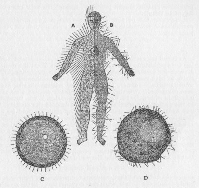 On the conclusion of this instruction, the better to enable the seeress to comprehend the description given in verses 9 and 16, a vision was given her of two human forms, having their molecules, the one in the order of man regenerate, and the other in the disorder of man unregenerate, as on the two sides, A and B, of the figure on p. 189, which represents a combination of the half of each form thus beheld. In the case of specific organs, the rays represent the magnetic direction of each organ as a whole, and not that of its constituent molecules, since the orderly polarisation of these is not to the common centre of the system, but to the centre of their own particular organ, and only mediately through this to the common centre.